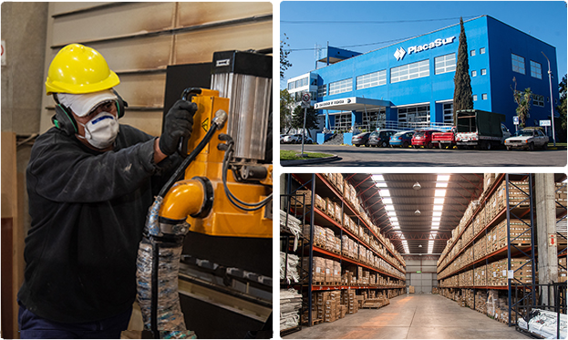 Ediliciamente contamos con un amplio salón de exposición, depósitos sectorizados para herrajes, placas y cortes. Sumamos recientemente un área cubierta de carga y descarga, nuevos sistemas de almacenamiento, equipos y maquinaria con el fin de mejorar nuestro servicio de entrega.